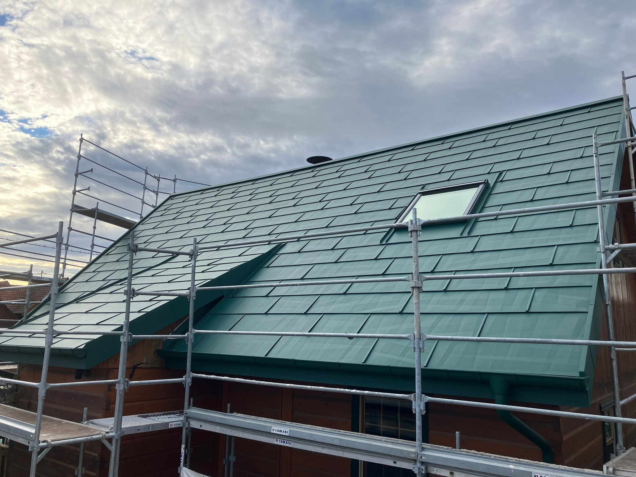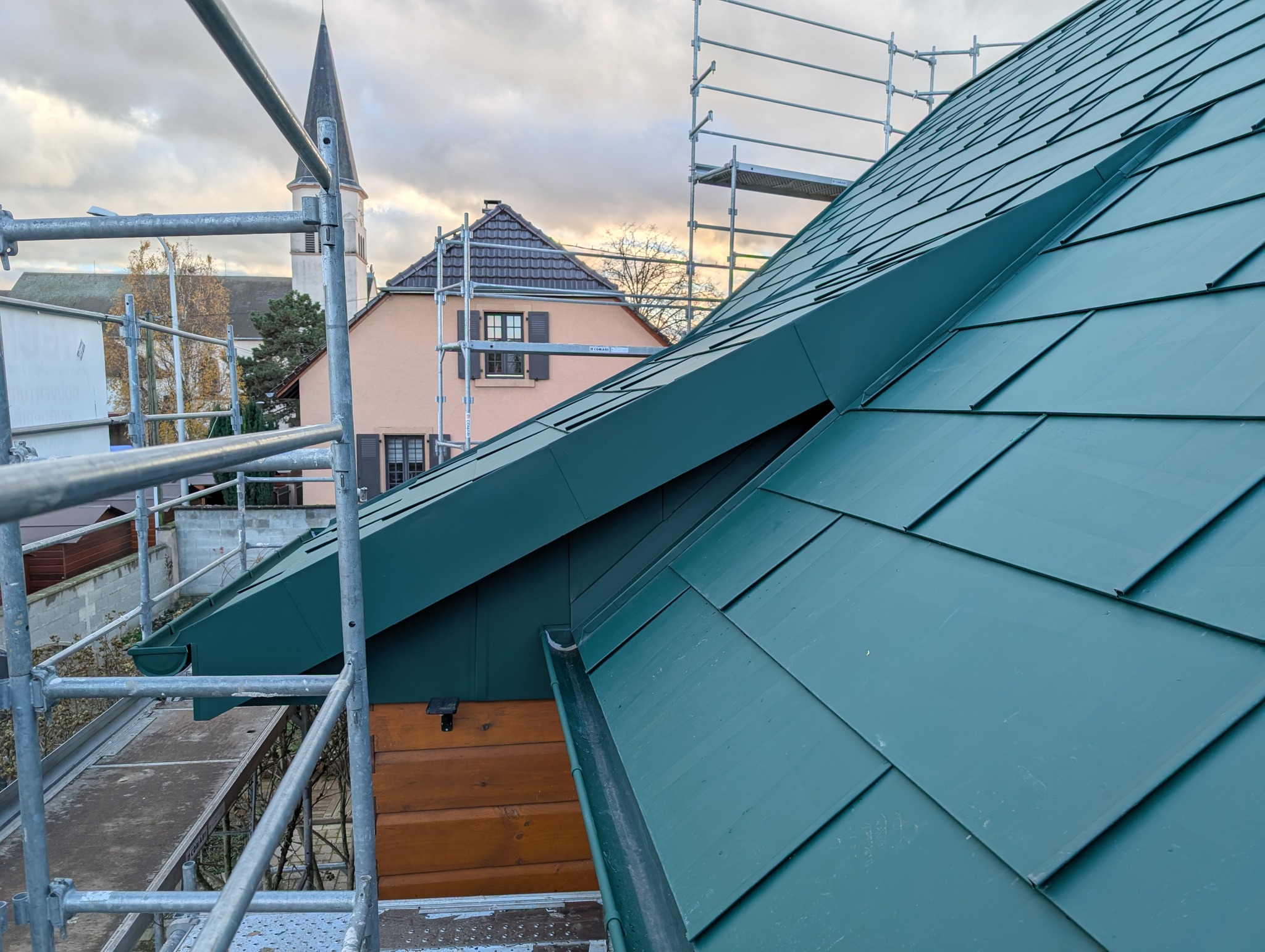 À Neuf-Brisach dans le Haut-Rhin, notre équipe de couvreurs-zingueurs a posé une couverture neuve en profils PREFA FX 12 vert mousse, alliant légèreté et robustesse. L’évacuation et la boîte à eau Super Green Korben assurent une gestion optimale des eaux pluviales et une étanchéité sans faille. Détail des finitions et raccords soignés pour un résultat harmonieux, conforme aux normes les plus exigeantes.