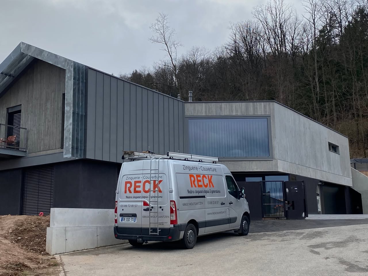 Pour cette réalisation signée KNL Architectures à Wolfgantzen (68), Reck Couverture a posé un habillage à joint debout en zinc Quartz VM Building Solutions, sublimant les volumes contemporains de la Villa H. La toiture terrasse, étanchée avec une membrane EPDM Hertalan, offre confort et durabilité. Finitions impeccables et intégration paysagère réussie pour un service complet de couverture et zinguerie.